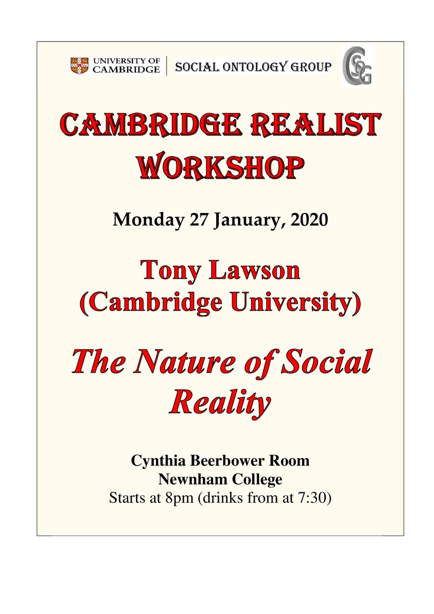 Reminder! Our first Cambridge Realist Workshop starts this Monday, Jan 27, with Tony Lawson on "the Nature of Social Reality"