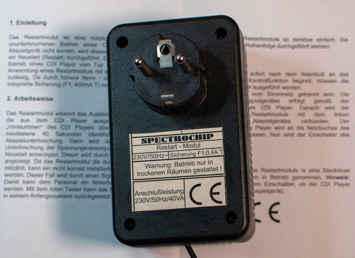Spectrochip Restartmodul for GDI-750: It interrupts the power briefly to restart the player if it doesn't detect any audio signals for 40 seconds.