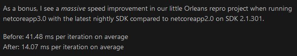 Running .NET Core nightly builds to test the fix on this issue and there is a tremendous speed boost compared to .NET Core 2.1.301 https://github.com/dotnet/corefx/issues/30781#issuecomment-402371237 …pic.twitter.com/OpibSmm5KJ