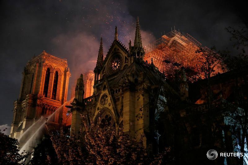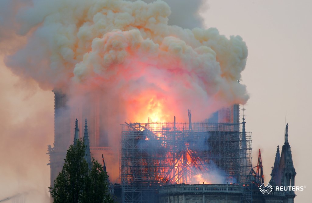 Flames burst through the roof of the centuries-old Notre-Dame Cathedral and quickly engulfed the spire, which collapsed. More photos: https://reut.rs/2Get5TF pic.twitter.com/akj0O1b9lm