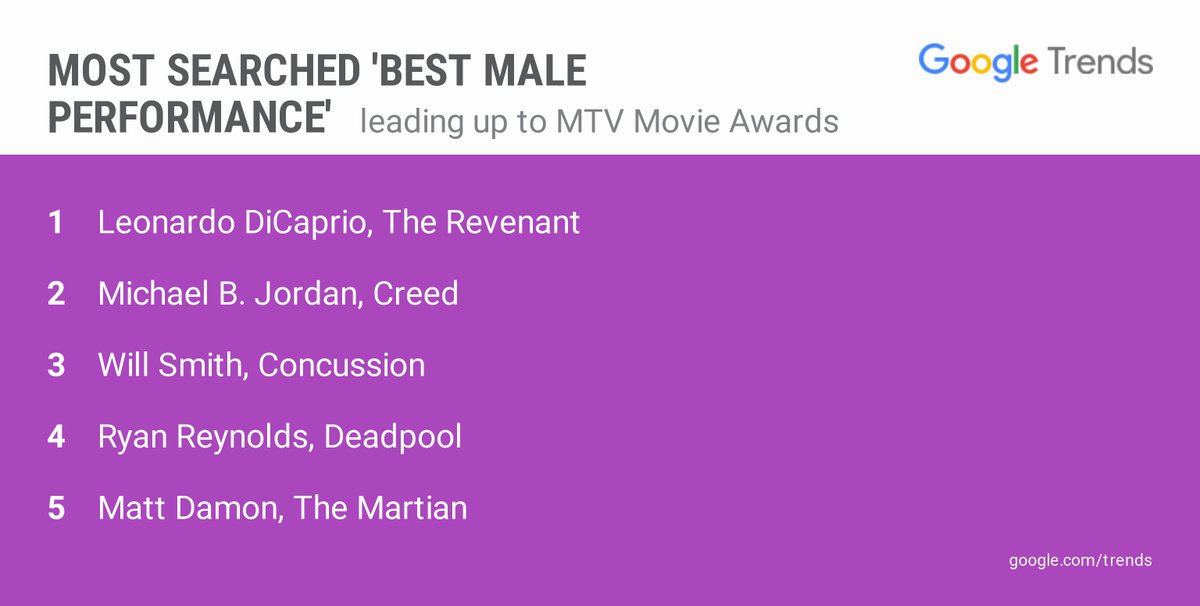 @LeoDiCaprio in@RevenantMovie is the most searched "Best Male Performance" nominee leading up to#MTVMovieAwardspic.twitter.com/8eCxyPTR7i