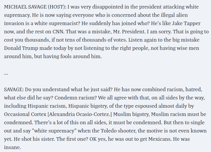 'why is everyone talking about so-called white supremacy? there's not one iota of white supremacy anywhere in what happened. well ok fine there's that one guy who was out to get mexicans. but other than that!' - michael savage basically https://www.mediamatters.org/michael-savage/michael-savage-i-was-very-disappointed-president-attacking-white-supremacy …pic.twitter.com/w2dfEUyXMT