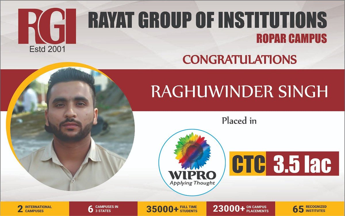 #ECE student placed @#wipro ,#joinrgi to find golden placement opportunities. The dedicated and learning environment of#rgi is a successful mantra for students at Rayat Group of Institutions.#RGI feels extremely proud of our brilliant Student "Raghuvinder".We wish you#successpic.twitter.com/KJqHJmlMTk