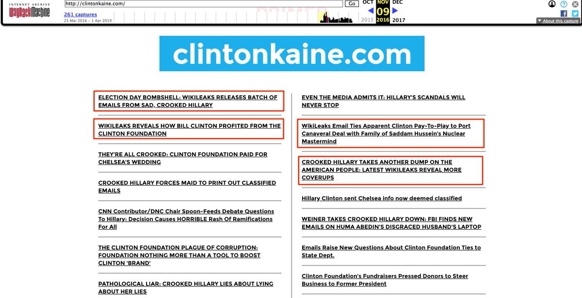 Continuing on to the election, Trump’s clintonkaine[.]com site would push at least 15 links to articles or opinion pieces based on or related to Wikileaks.pic.twitter.com/bmigPl841r