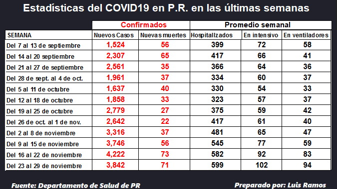 #COVID19 en PR, 27 de nov: Nuevos casos Confirmados (Pcr/Molecular) +1,350. Nuevos casos probables (Serológicas y antígenos) +870. Muertes confirmadas +5, Tasa letalidad de 1.7%. Hospitalizaciones -15, en intensivo, +5 ventiladores +3.pic.twitter.com/5xv235ONpJ