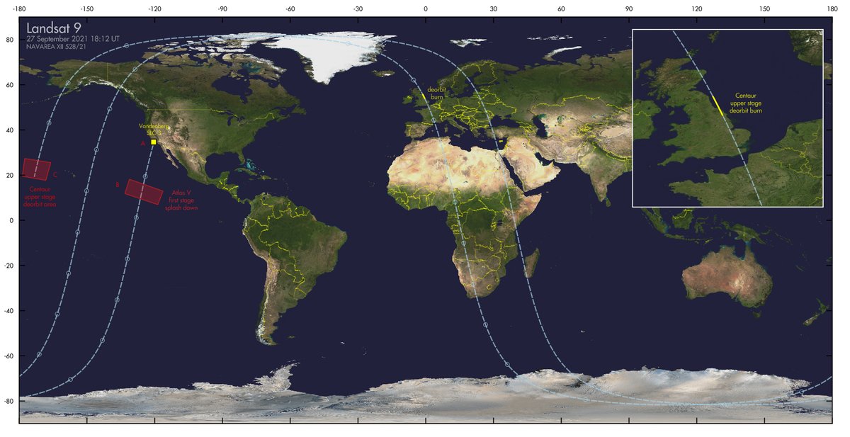 #Landsat9 launches tonight, NW Europe might see the Centaur upper stage deorbit burn around 21:10 UT (23:10 CEST, 22:10 BST), located over the UK east coast, just as it comes out of Earth shadow. (HT to@cgbassa for noting the sighting opportunity, map below by me)pic.twitter.com/HNUKsRC8Lj