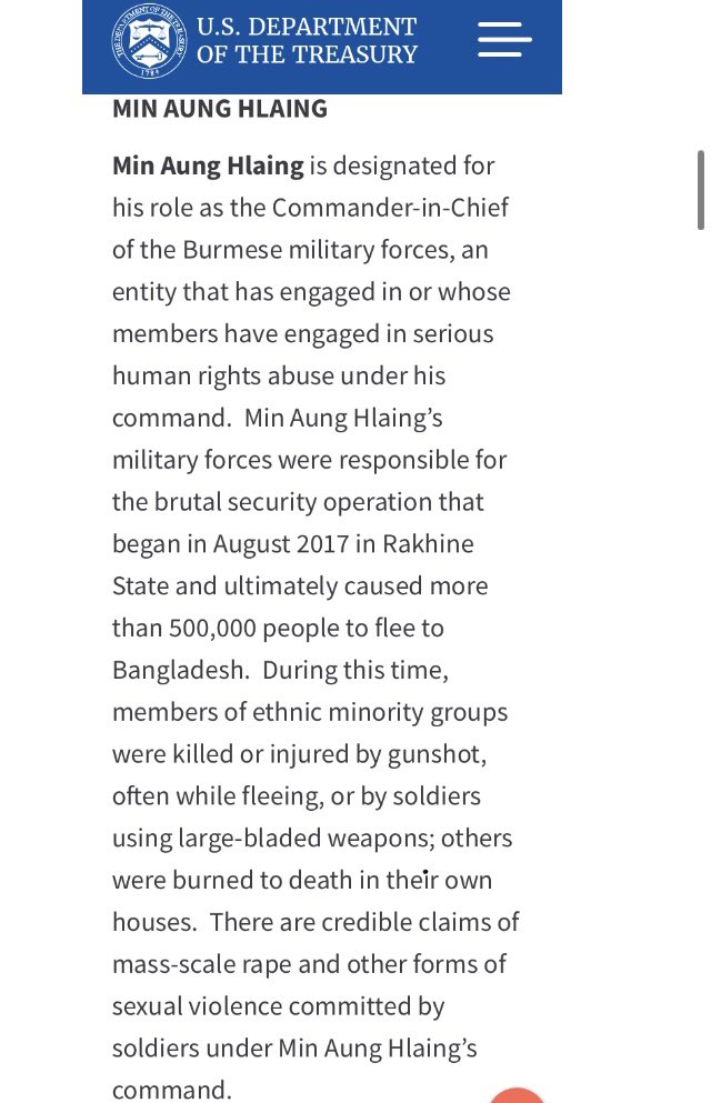 The commander in chief of Myanmar’s armed services, Min Aung Hlaing, who has reportedly seized control of the country, has been under US sanction since December 2019. He was designated for serious human rights abuses committed against the Rohingya.pic.twitter.com/d1CaGDvcI4