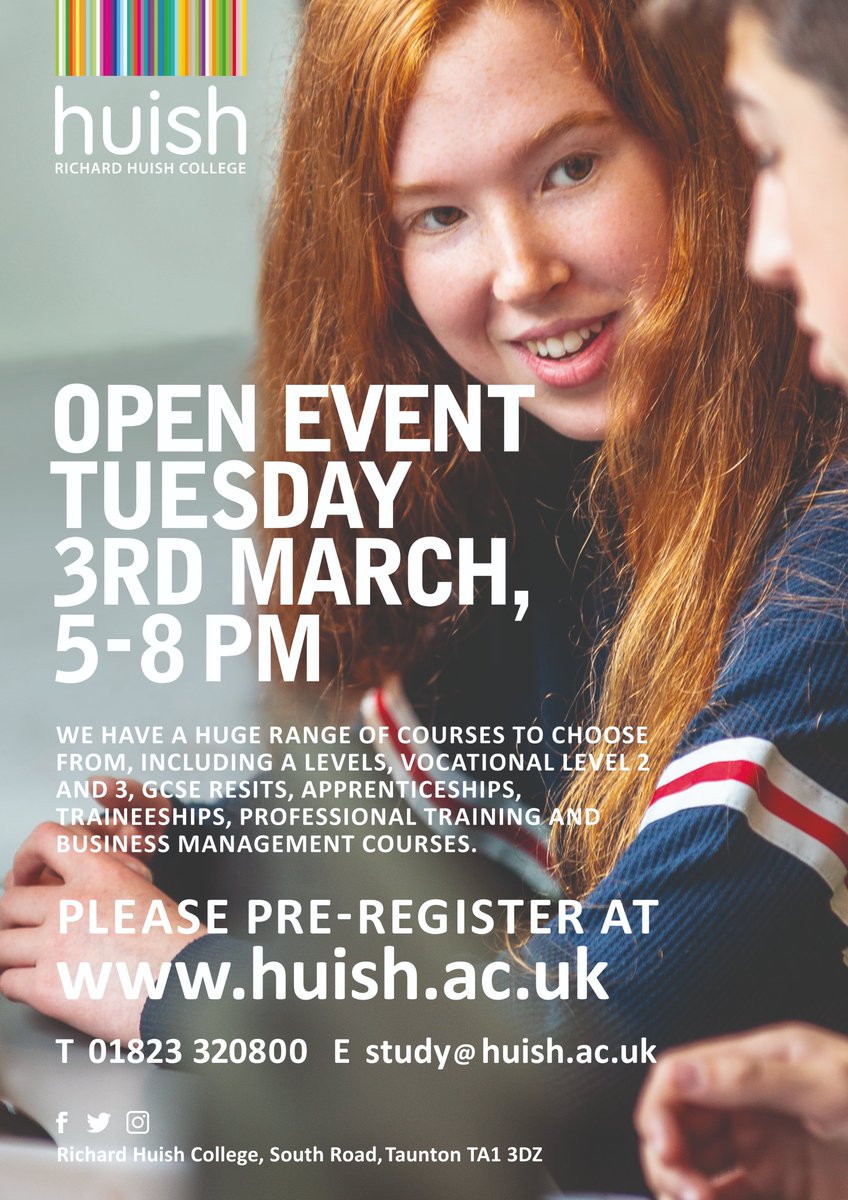 #OpenEvent of the academic year! Join us Tuesday 3rd March (5.00-8.00pm) to find out about a wide range of#ALevel and#Vocational courses as well as#Apprenticeships and Professional Opportunities. Register here: https://www.huish.ac.uk/event/open-event-4/ …pic.twitter.com/rBHfwn4VZp