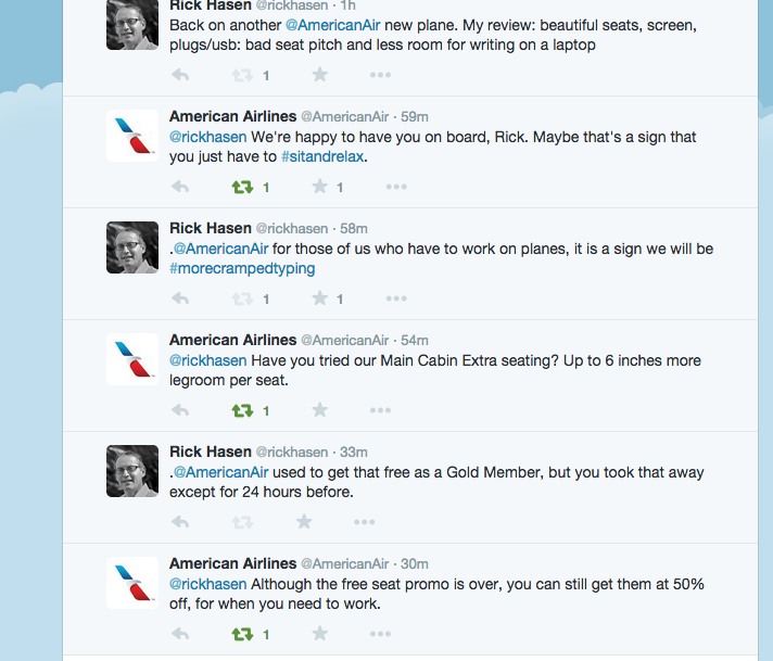 .@Goldfarb The "You're welcome, Rick!" from @AmericanAir was in response to this tweet:https://twitter.com/rickhasen/status/531121793248276480 …