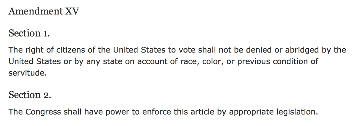 15th Amendment prohibits only discrimination in voting on basis of race. Does not guarantee anyone right to vote.https://twitter.com/sahilkapur/status/628662422920949760 …