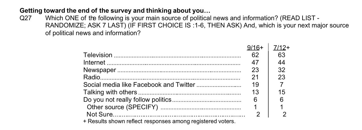 NBC/WSJ poll: Where do you get your news? *Television: 62% *Internet: 47% *Newspaper: 23% *Radio: 21% *Social media: 19% pic.twitter.com/WdmlFsp8gA