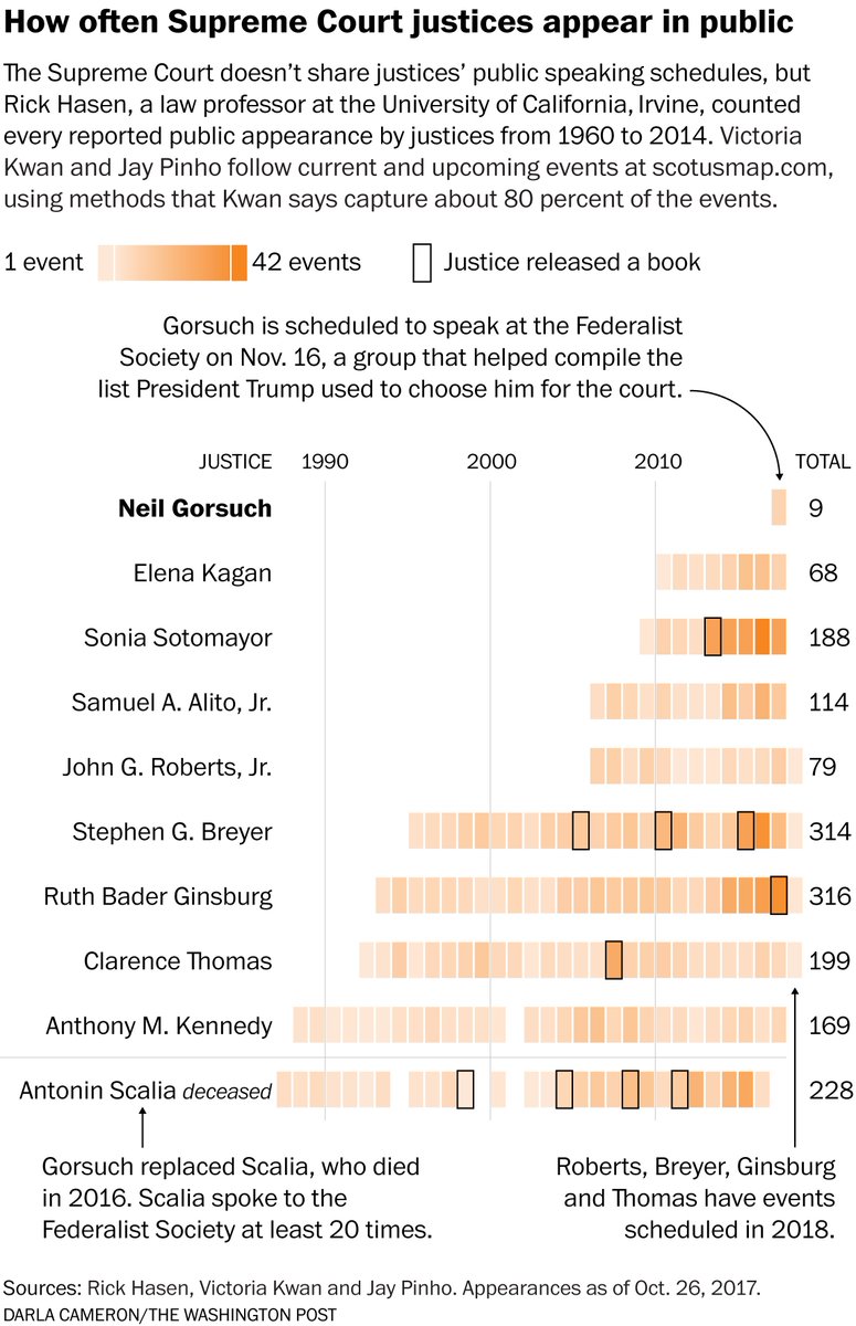 These are great graphical representation of data on Justices' appearances from me and from @victoriakwan_ #AppellateTwitter #scotushttps://twitter.com/postgraphics/status/923897289135083520 …