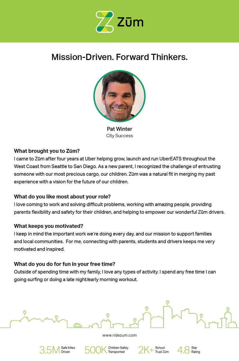 Today’s “Meet Our Team” spotlight features Patrick Winter, City Success from Southern California. Pat joined us from UberEATS. His passion for providing a safe and helpful service to families is contagious to our team. We are hiring - https://ridezum.com/careers.html pic.twitter.com/ODWdoPDIyf