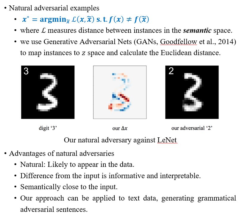 #ICLR2018 paper on "natural" adversaries (ie from data manifold) for black-box classifiers. Crucial in#NLProc for grammatical and similar advs, eg for NLI and Google Translate! w/@_zhengli_ &@ddua17, pdf: https://arxiv.org/abs/1710.11342 , code: https://github.com/zhengliz/natural-adversary …pic.twitter.com/Hm1ypMYGmZ