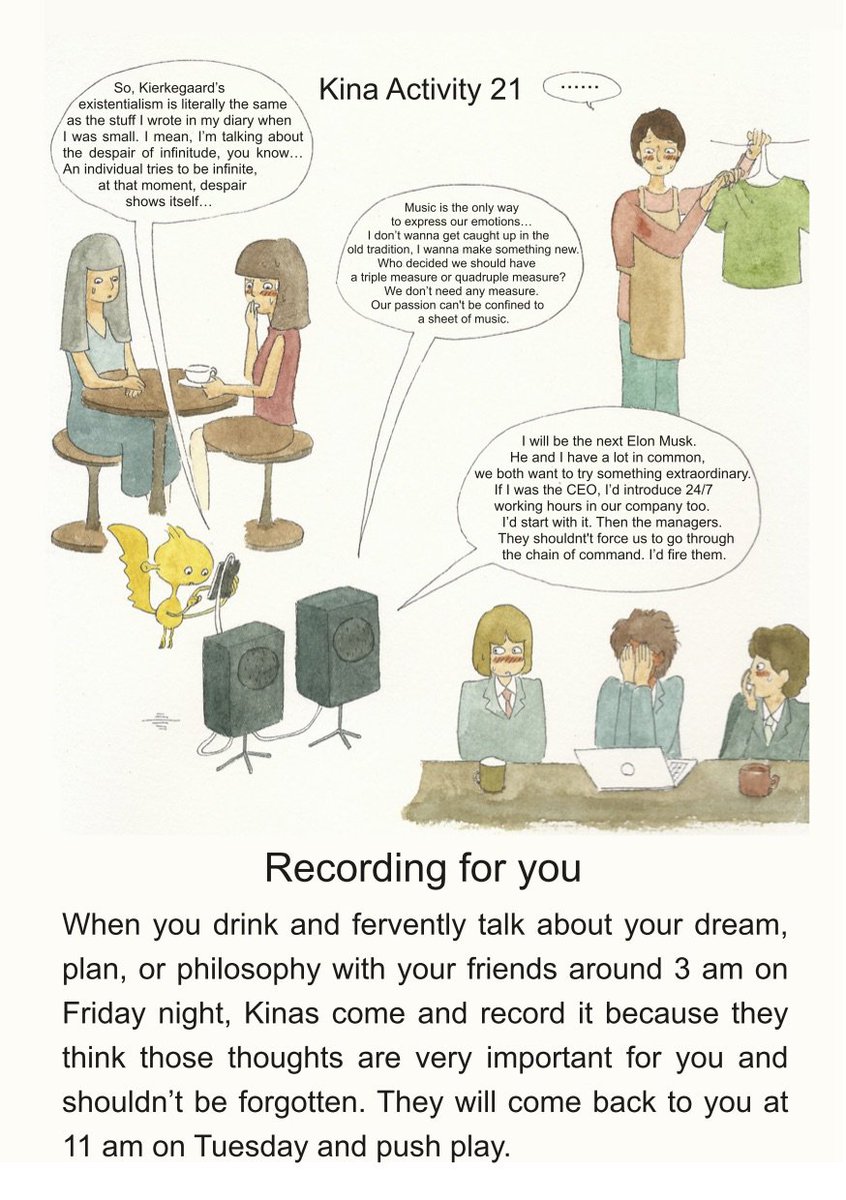 21: When you drink and fervently talk about your dream, plan, or philosophy with your friends around 3 am on Friday night, Kinas come and record it because they think those thoughts are very important for you. They will come back to you at 11 am on Tuesday and push play.
