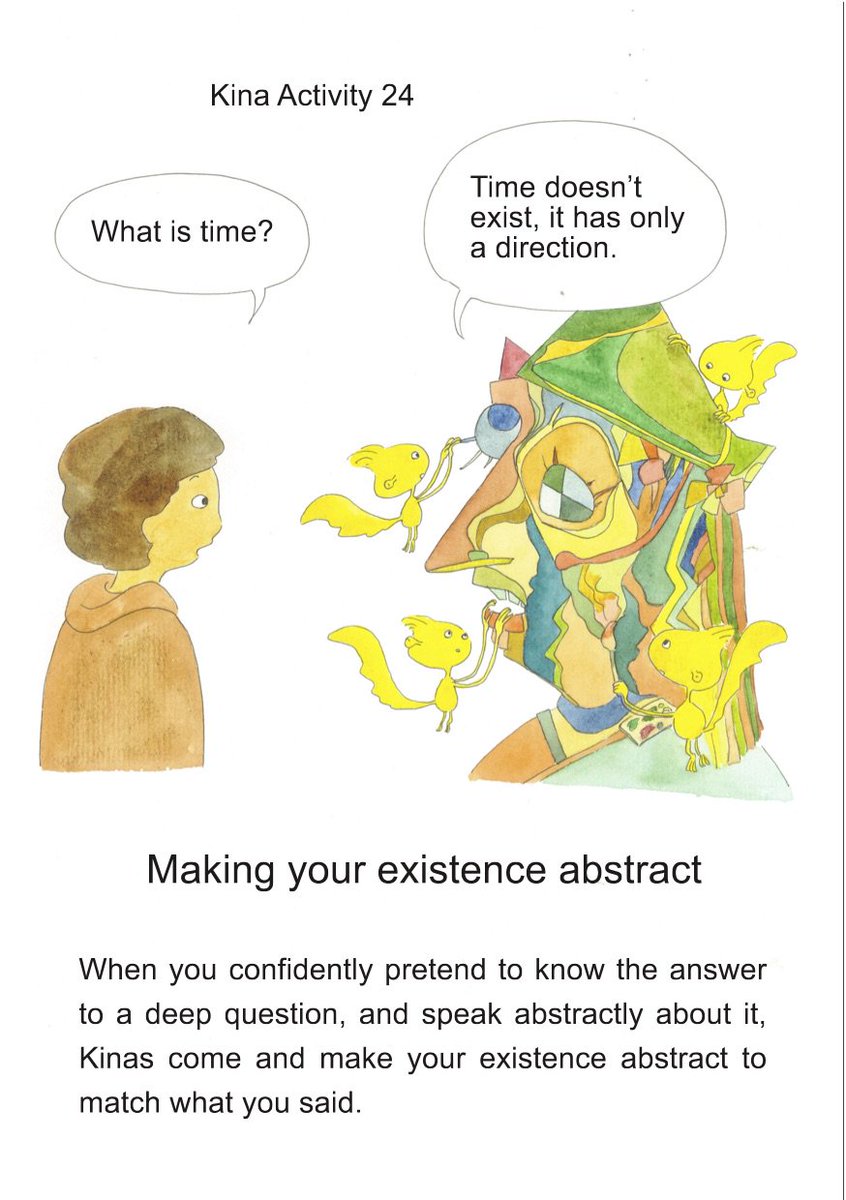 Kina Activity 24: Making your existence abstract When you confidently pretend to know the answer to a deep question and speak abstractly about it, Kinas come and make your existence abstract to match what you said.