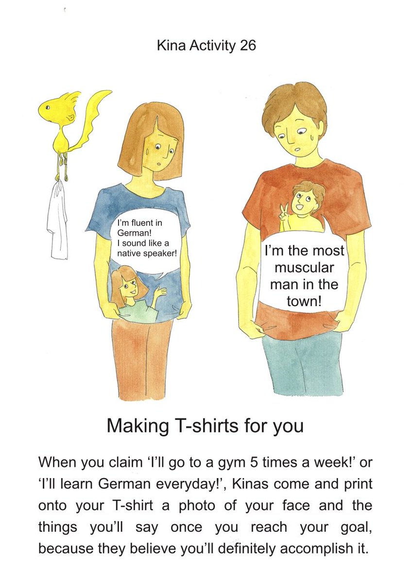 Kina 26: Making T-shirts When you claim ‘I’ll go to a gym 5 times a week!’ or ‘I’ll learn German every day!’, Kinas come and print onto your T-shirt a photo of your face and the things you’ll say once you reach your goal because they believe you’ll definitely accomplish it.