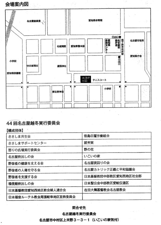 ご協力頂ける方は是非。第44回名古屋越冬活動、期間2018年12月28日(月)~2019年1月3日(木)、会場:名古屋市中区三の丸2丁目7大津橋小公園内外堀通り(テニスコート西側、※会場は車の乗り入れは出来ませんので、近隣駐車場か公共交通機関をご利用下さい(地下鉄名城線市役所駅徒歩10分))