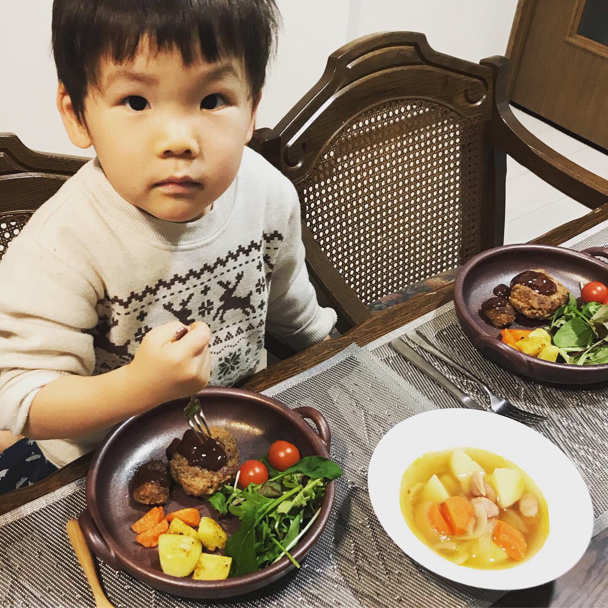 いつもお買い物もお料理も手伝ってくれます* 今日はにんじんたっぷりハンバーグを一緒に☆ 「パパとママの分の大きいのもつくるよー!」と一生懸命作ってくれました! 「一緒に作って食べるとおいしいねー!」とお話しながら愉しいお食事* これからも一緒に色々作りたい^_^ 料理好き男子になーれ!pic.twitter.com/6sWUFonLED