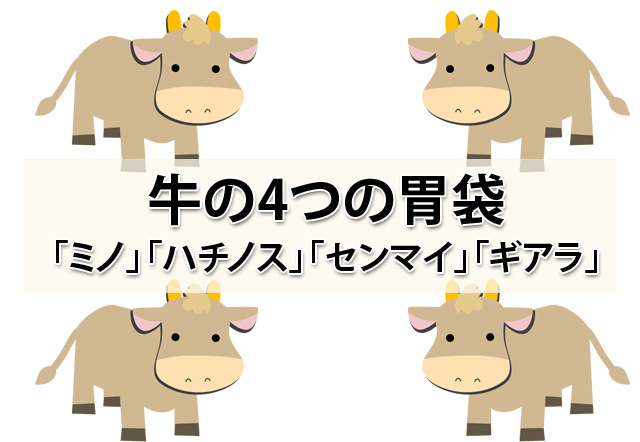 牛の4つの胃袋? 知っていれば、間違いなくハナタカ? ①ミノ…胃袋全体の8割を占め、肉厚で脂肪分が多め ②ハチノス…希少価値が一番高い ③センマイ…鉄分や亜鉛が豊富で、脂肪分が少ない ④ギアラ…もっとも濃厚な味わいが楽しめる部分
