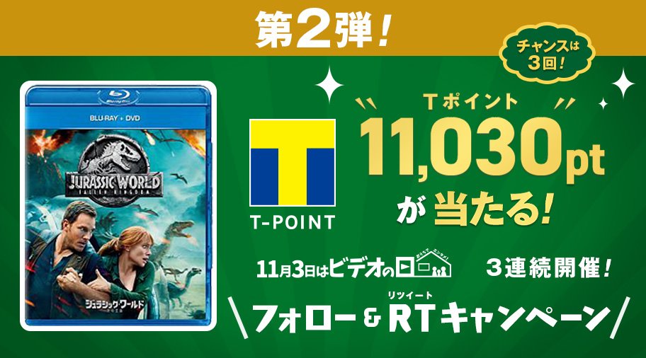#11月3日はビデオの日 キャンペーン実施中 ⇒https://bit.ly/2Pg0rUG 『ジュラシック・ワールド炎の王国』12月5日(水)発売! TSUTAYA限定セットも RTで11,030pt当たる!~12月17日(月)まで ①@shop_TSUTAYA をフォロー ②このツイートをRTするだけpic.twitter.com/XGWc0U0cQo