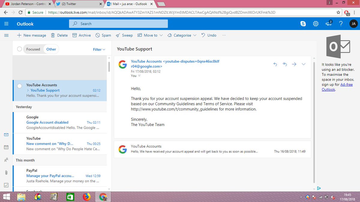 Well @YouTube has decided to keep my account suspended, so that's that i guess. I honestly hate the dry basic cold robotic response they give to the casual deletion of my channel through false flagging. I guess i just had the "wrong opinion" right guys? Youtube 2018 people.pic.twitter.com/4MNH5W9sWC