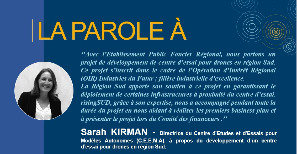 @risingSUD#SarahKirman, Directrice du Centre d'Etudes et d'Essais pour Modèles Autonomes (C.E.E.M.A), à propos du développement d’un centre d’essai pour drones en région Sudpic.twitter.com/ETfaE1zbi9