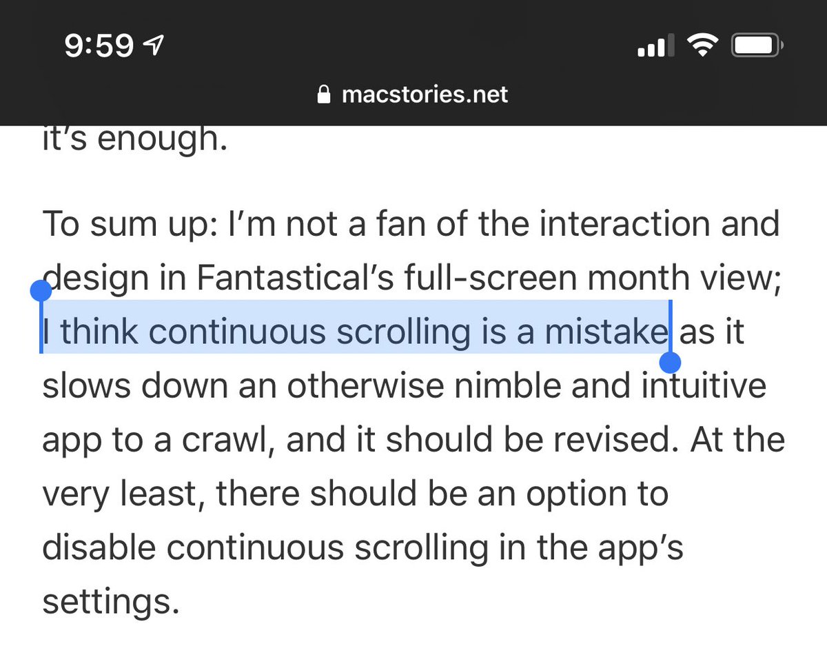 @viticci here. Continuous scroll is one of the features I consider must have. The issue is performance, not that design choice. Don’t kill the feature, fix the performance.pic.twitter.com/b4aSDGqOcg
