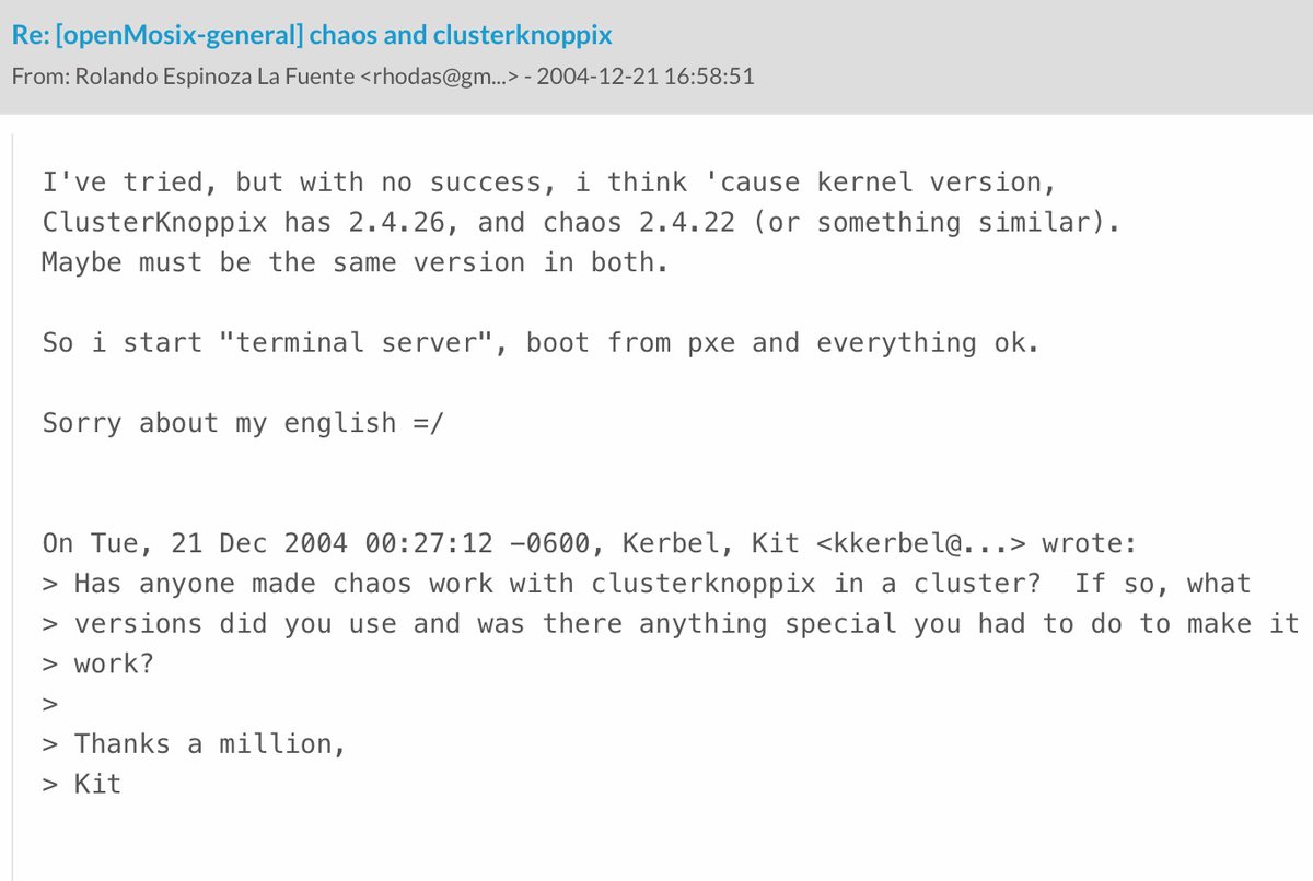 Someone said, if you want to backup something, upload it to the internet. Equivalently, write it in a public mailing list or forum. Me in '04, sharing my experience about a PXE-booted knoppix cluster and something called chaos. Still can't write english properly :Dpic.twitter.com/5fSa6XpaOY