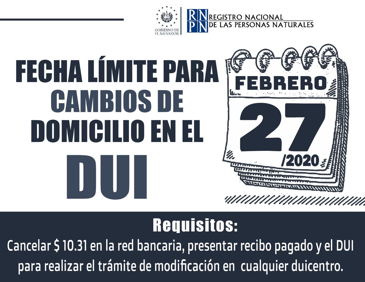 El @rnpn_sv le recuerda a la ciudadanía que el 27 de febrero del 2020, es la fecha límite para hacer cambios de dirección en el DUI y que ésta sea incluida en el padrón electoral de las elecciones del 28 de febrero de 2021
