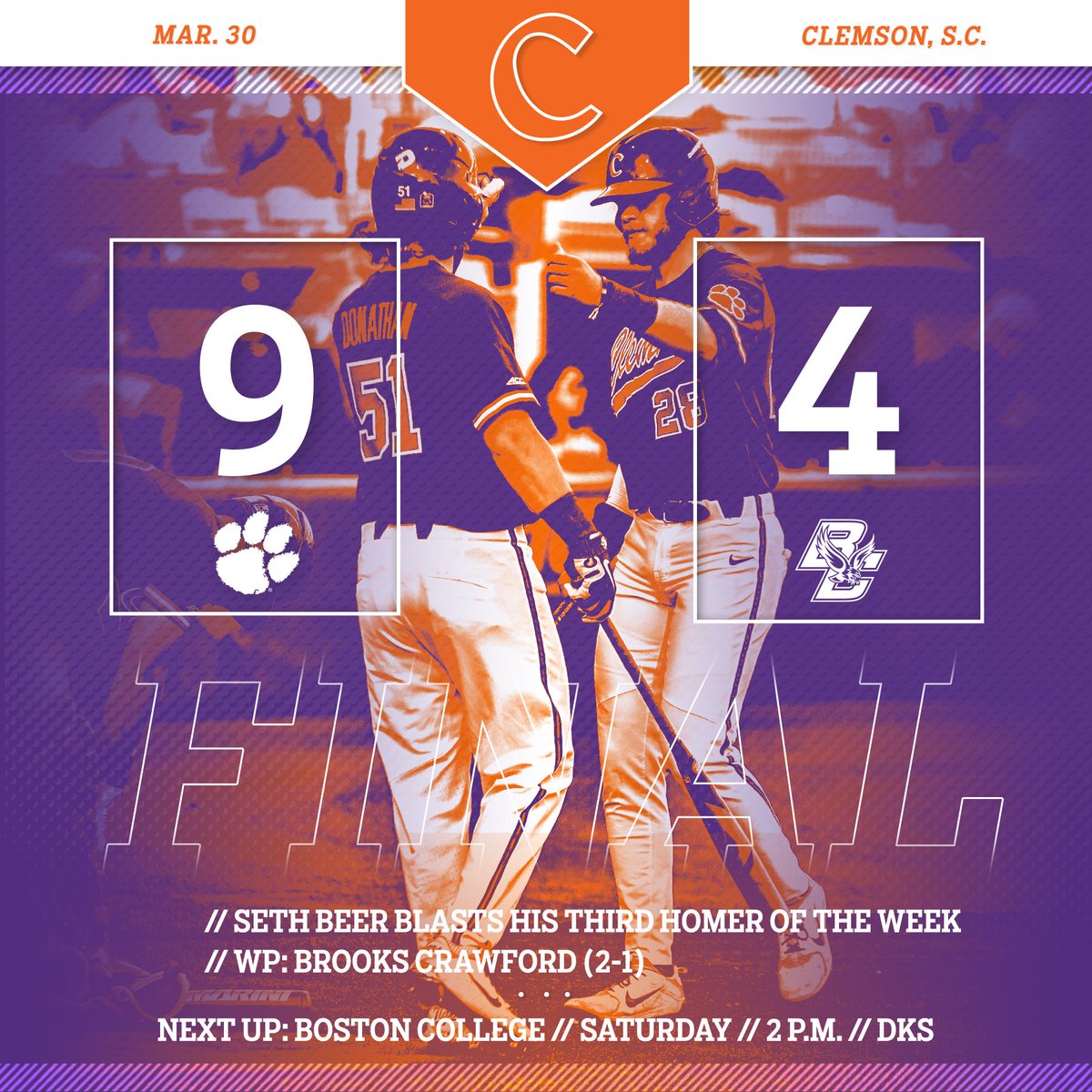@ClemsonBaseball game against the Boston College Eagles tonight at the Doug!#Clemson#ClemsonFamilyThanks. Twitter will use this to make your timeline better. UndoUndo -