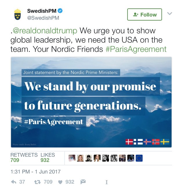 Sweden's PM urged Trump to "show global leadership" and uphold our promise to future generations.