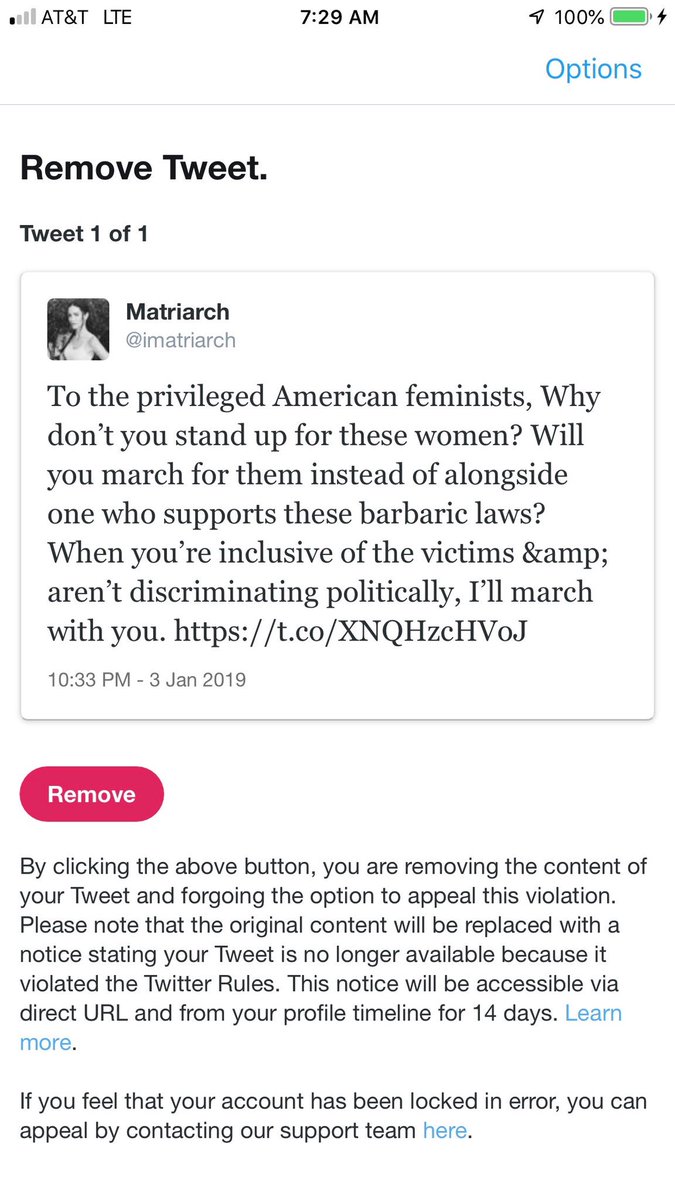 Twitter locked my wife’s account @imatriarch for a tweet where she denounced the stoning of a woman and challenged American feminists to march against that.