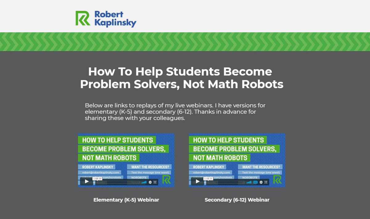 Tired of students getting correct answers, yet not really understanding what they're doing? Then you should check out the recording of my How To Help Students Become Problem Solvers, Not Math Robots webinar with K-5 & 6-12 versions. https://robertkaplinsky.com/norobotswebinar