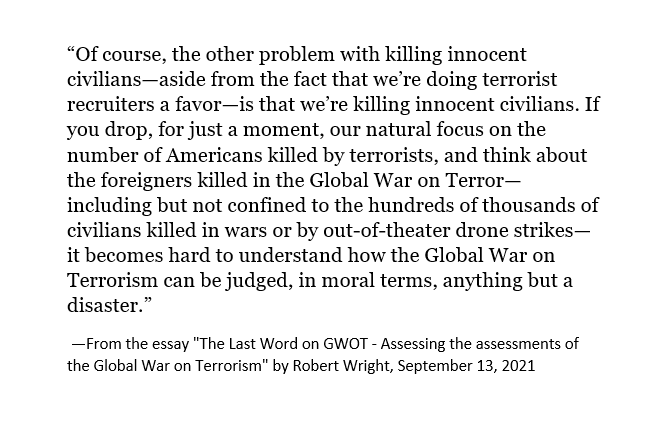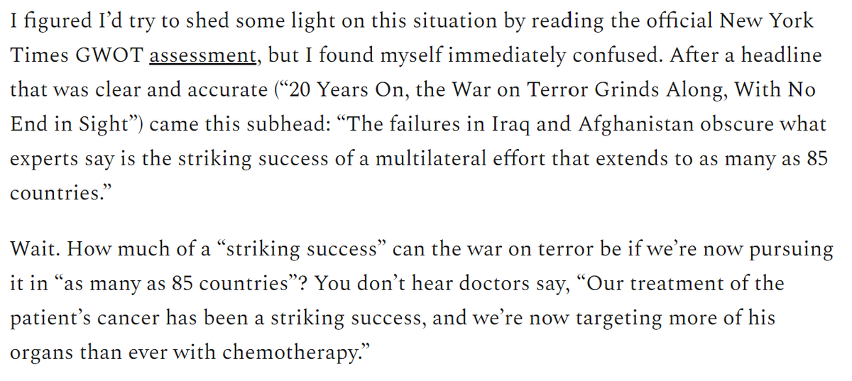 Good piece: "How much of a “striking success” can the war on terror be if we’re now pursuing it in “as many as 85 countries”? You don’t hear doctors say, “Our treatment of the patient’s cancer has been a striking success, and we’re now targeting more of his organs than ever..."https://twitter.com/robertwrighter/status/1438136631312142349 …