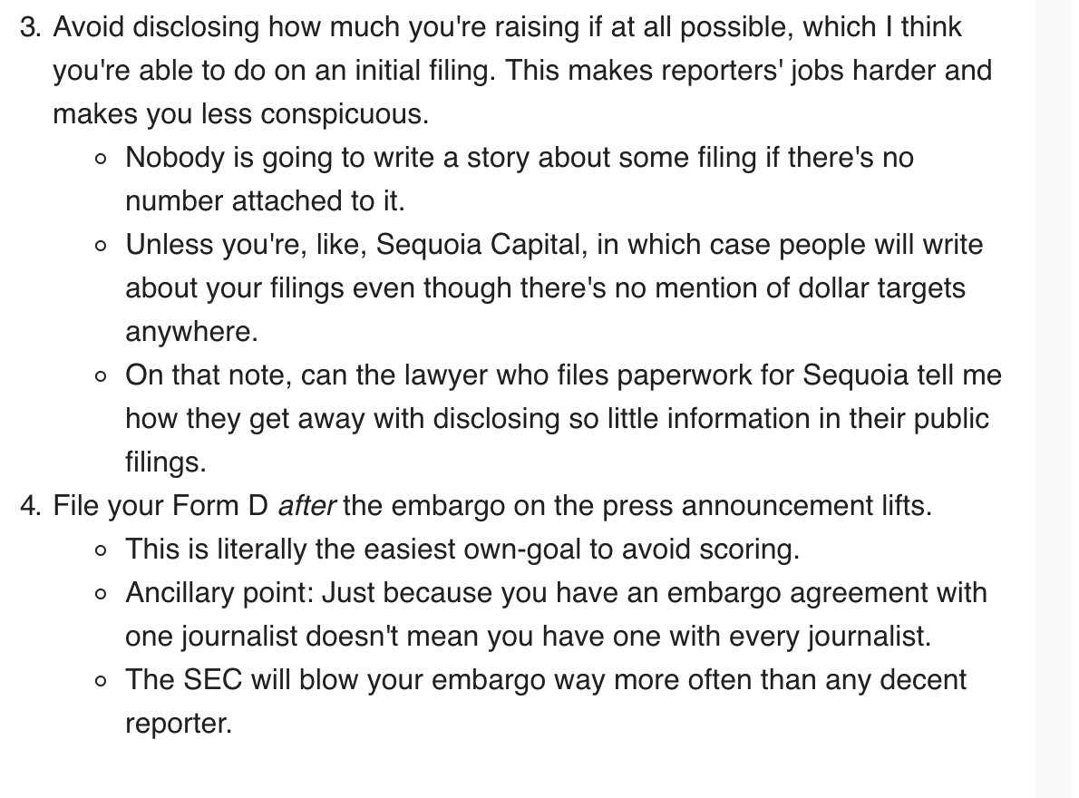 A tech reporter who relies upon Form D filings to get funding scoops, tells founders how to hide from his prying