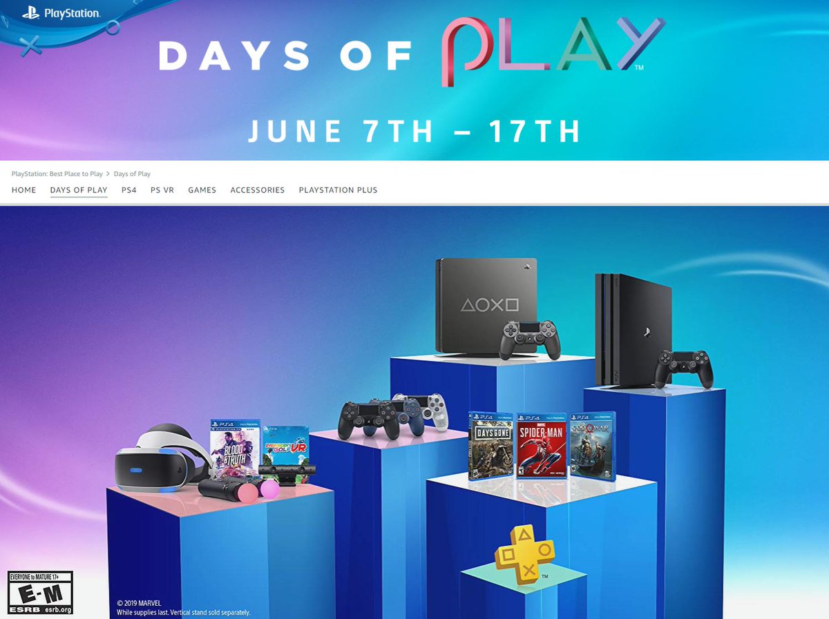 PlayStation Days of Play sale Amazon https://amzn.to/2K4pITI Best Buy http://bit.ly/2IvhW1Y GameStop http://bit.ly/2IpLwG1 Target http://bit.ly/2IuVx4L Walmart http://bit.ly/2IuVxlh pic.twitter.com/q2fUi3D1K5
