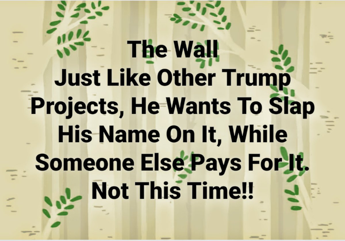 The Wall Just Like Other Trump Projects, He Wants To Slap His Name On It, While Someone Else Pays For It. Not This Time!!pic.twitter.com/mQizvHmBlc
