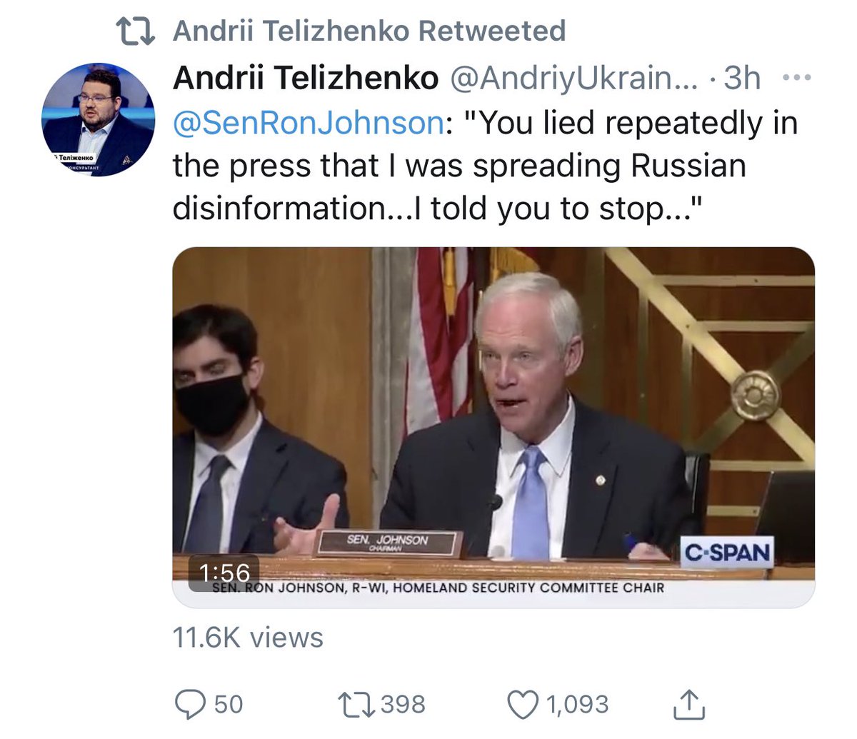 @SenRonJohnson claims to not receive Russian disinformation the person who gave it to him, Telizhenko, is retweeting and showing his support for the Senator. Something just doesn’t add up here...