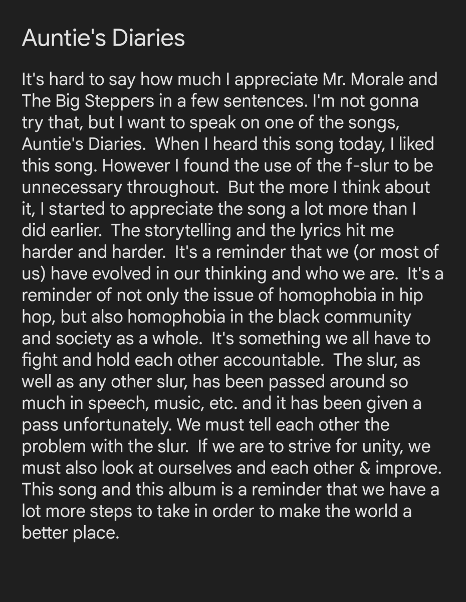 I really love Mr. Morale and The Big Steppers. But Auntie's Diaries hits hard and here's whypic.twitter.com/TkfxcbPnwG