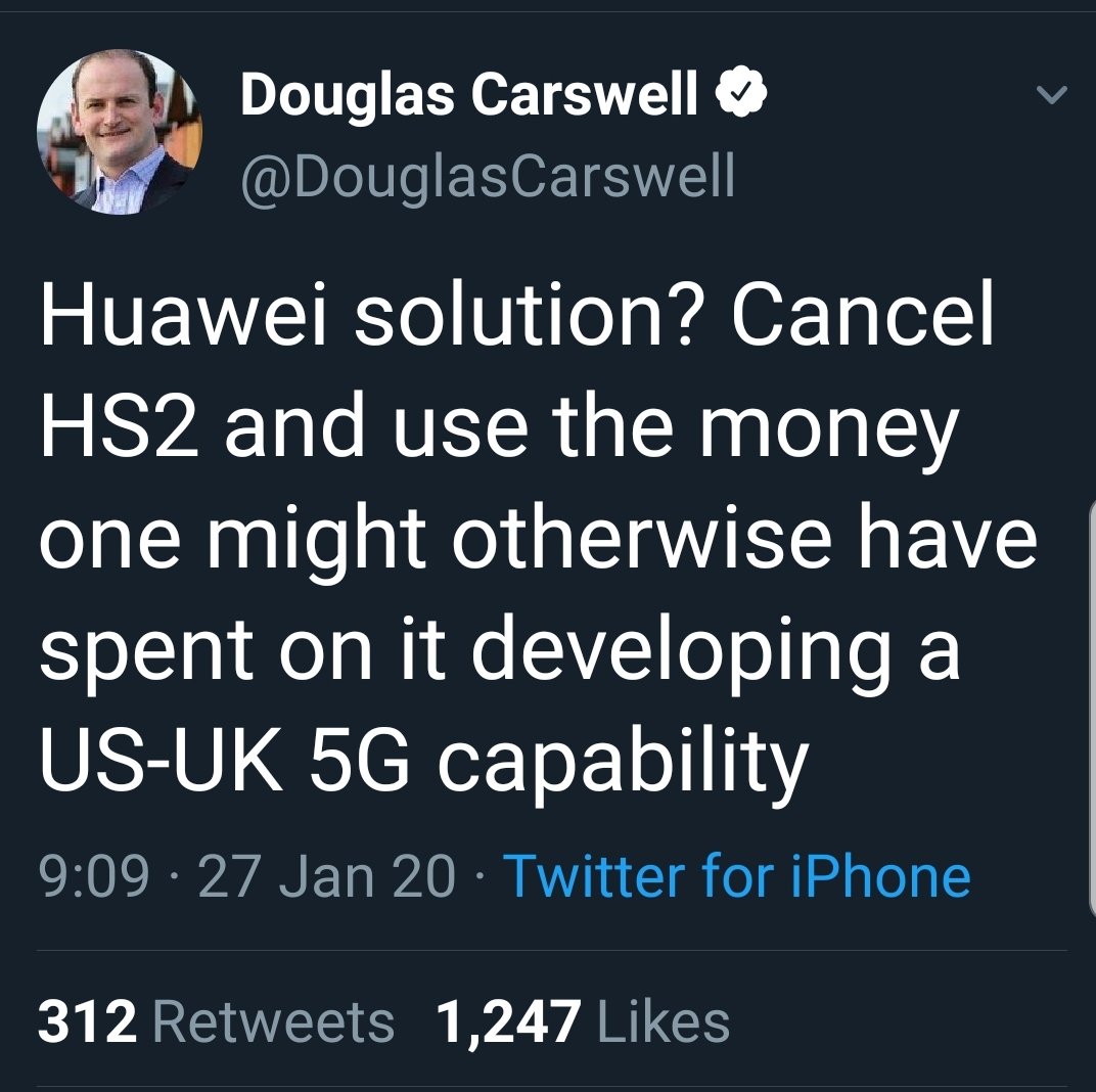 I particularly 'like' Ticey's comment. He thinks Huawei and HS2 are the defining strategic decisions for Boris Johnson in this parliament. So nothing about Brexit then.pic.twitter.com/0Zw9sSvYgg