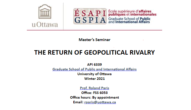 I benefit from reading other profs' course syllabi, so here's one of mine for anyone interested – an MA seminar on "The Return of Geopolitical Rivalry" http://aix1.uottawa.ca/~rparis/API6339_winter2021.html …pic.twitter.com/q2xYJGp0UX