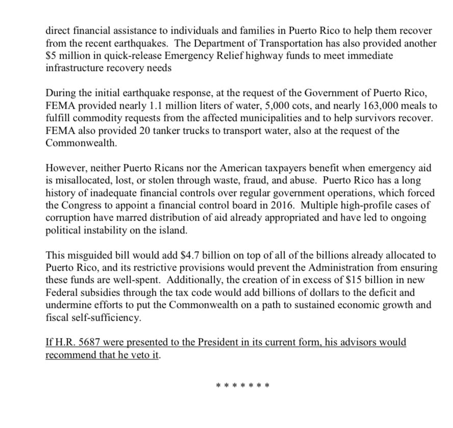 @WhiteHouse statement objecting to $4.7 billion in emergency aid to help Puerto Rico recover from a series of damaging earthquakes. The WH essentially says PR is getting enough & hasn't spent billions it has, such at 1.5 billion, of which only 11 million has been used.pic.twitter.com/uk3vov4aUT