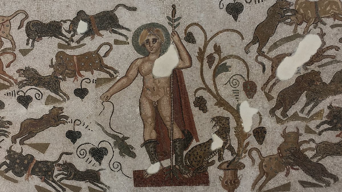 Man, nude except for cape and boots, with pet lizard on a leash, watching animals hunt. Late 4th century CE mosaic from Dougga, Tunisia.