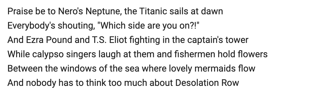 Dylan has something appropriate for just about every occasion. This passage is from the brilliant Desolation Row.pic.twitter.com/2q6hMDFsSv