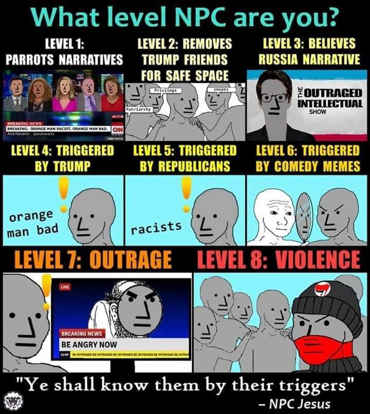 Orange man bad. All white men rapists. Black men chads. Stay at home dads good. Abortions good. Browning of America accelerate. Socialism. White man bad. Life sucks. I love wine. Sad and lonely. No children. Materialism. Nihilism. World worse. White tunnel. The end.