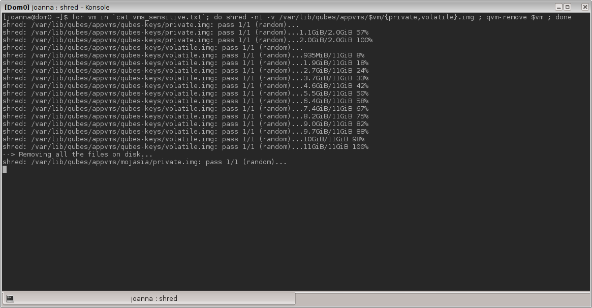 @___winston The fs in Dom0 does journaling only for meta, and I'm shredding only whole VM images, so no risk of any leak through metadata.