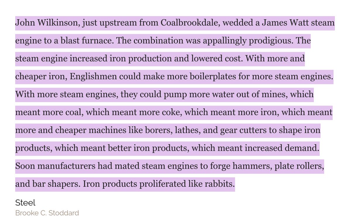 The three-way reinforcing cycle between coal, iron, and steam. Now add trains into the mix and you get an even stronger self-reinforcing cycle. The exponential takeoff curve of the Industrial Revolution results from every part of the economy strengthening many other parts