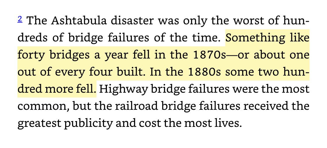 This footnote in McCullough's *The Great Bridge* blew my mind. As late as the 1880s, we still didn't know how to build bridges! We would put them up, and many would just collapse.pic.twitter.com/6vjfkQ482H