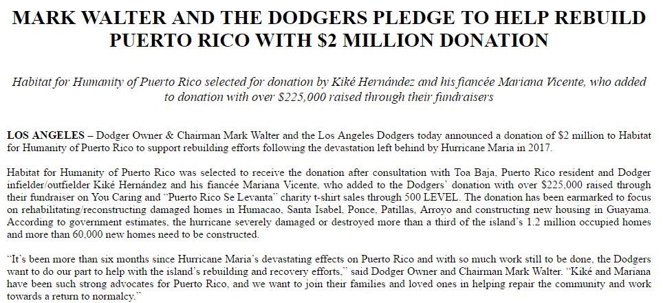 Thank you Mark and the entire Walter family and my team, THE LA DODGERS!!! Thank you for making this possible! It means EVERYTHING to me! PUERTO RICO LOS QUEREMOS!!!!